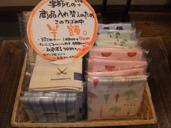 今日は半額セールのお知らせです。手ぬぐい、ガーゼハンカチなどの商品の一部を半額にて提供いたします。季節ものもあります。よかったらどうぞ。