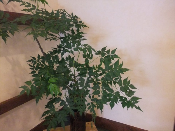 オープンの際にいただいた花が枯れてしまったので、裏庭の枝を拝借。新緑の美しい季節です。