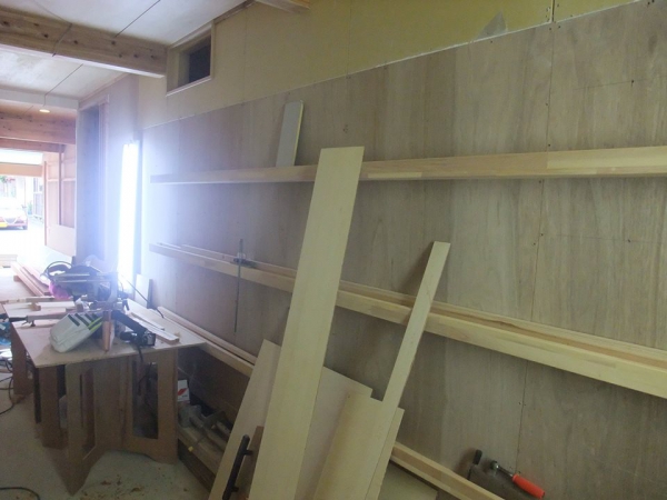 いつもの場所に戻って、日ごとに出来上がる店を見ながらの仕事は非常に楽しいものです。画像は本棚。どんな本を並べましょうか。