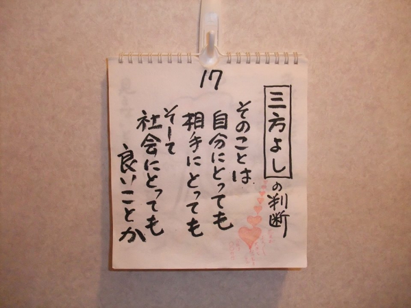 妻の嫁入道具の一つ。義父手作りの日めくりカレンダーです。人として、商売人として、大切なことが31書かれてあります。その中でも17日の右下にはハートがたくさん。